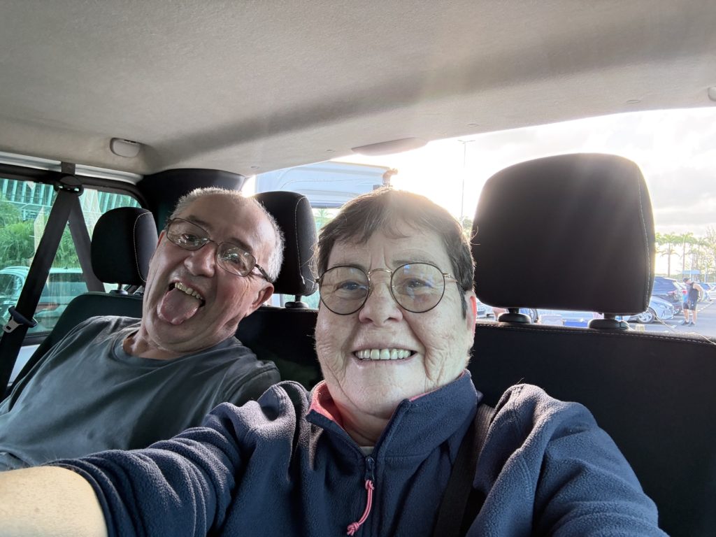 Mais personne avec une pancarte à notre nom ! On regarde partout, rien ! Maurice téléphone, pas de réponse. Au bout de trois fois, quelqu’un lui dit d’aller à tel endroit, il arrive.