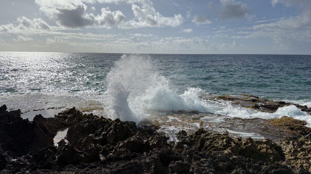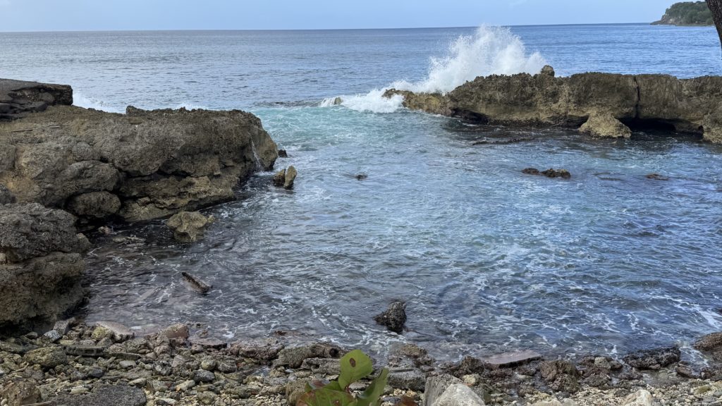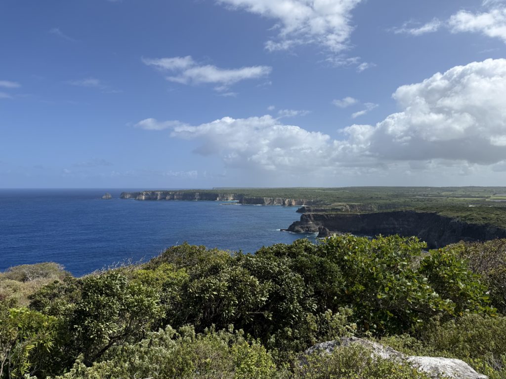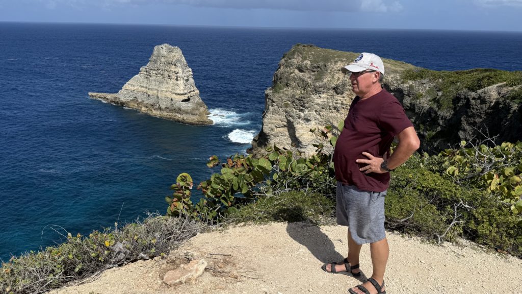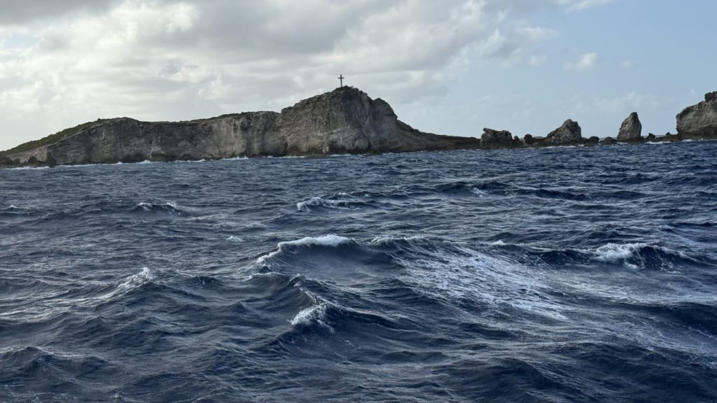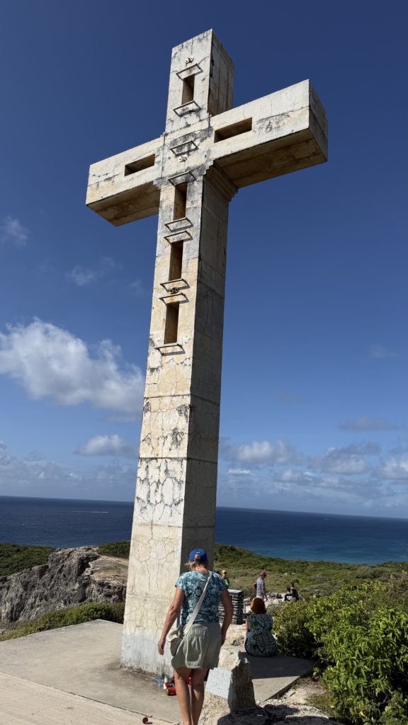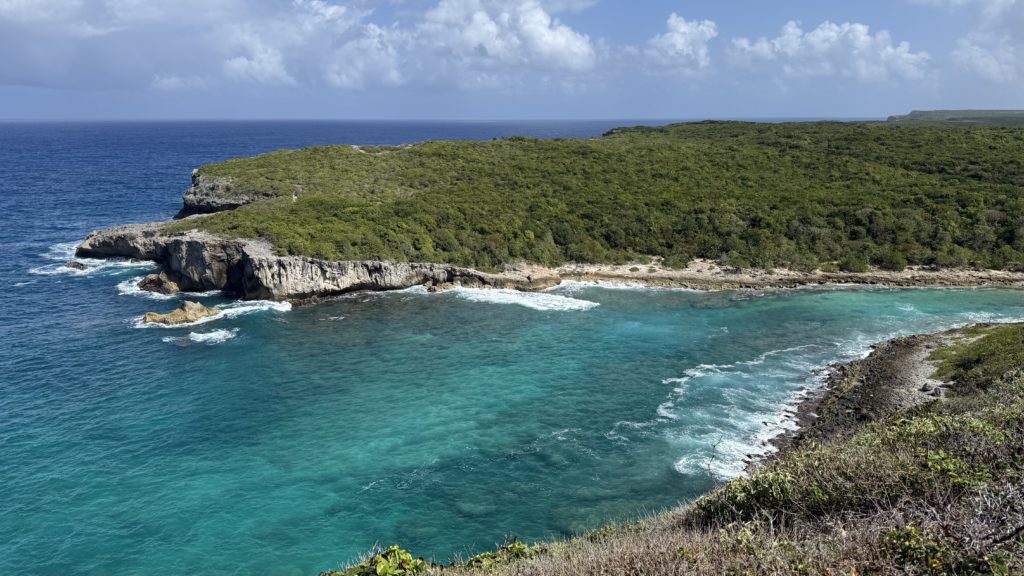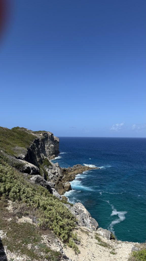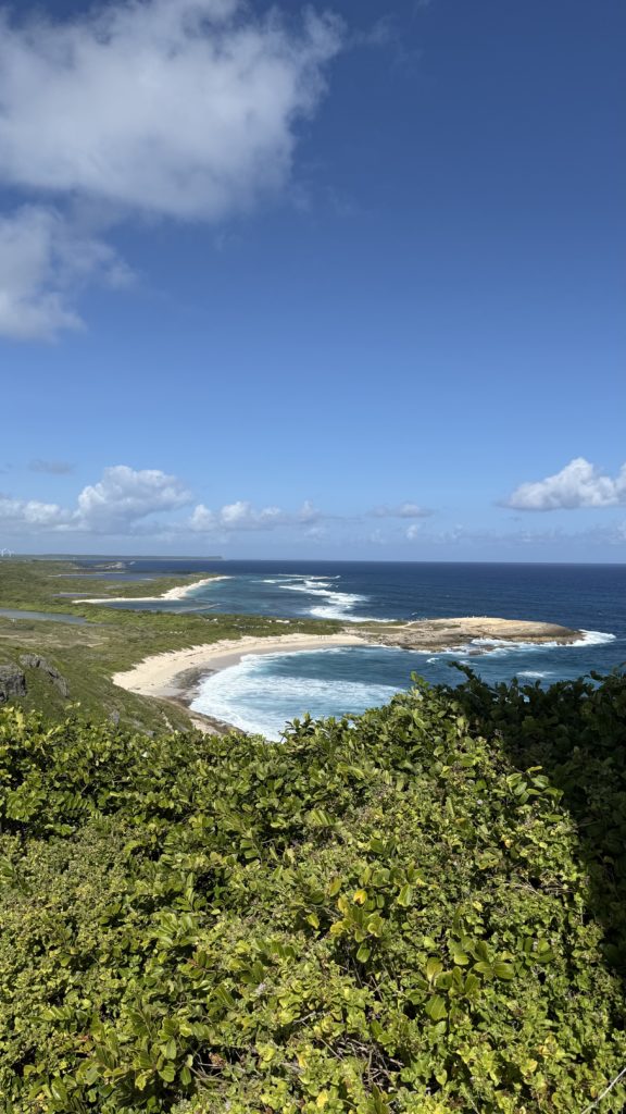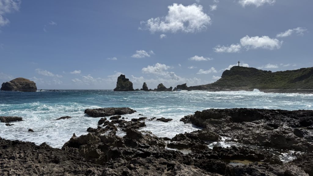 Arrivés à la croix : une étendue d’eau, l’île de la Désirade en face, les vagues sont monstrueuses… mais qu’est-ce que c’est beau 😍.