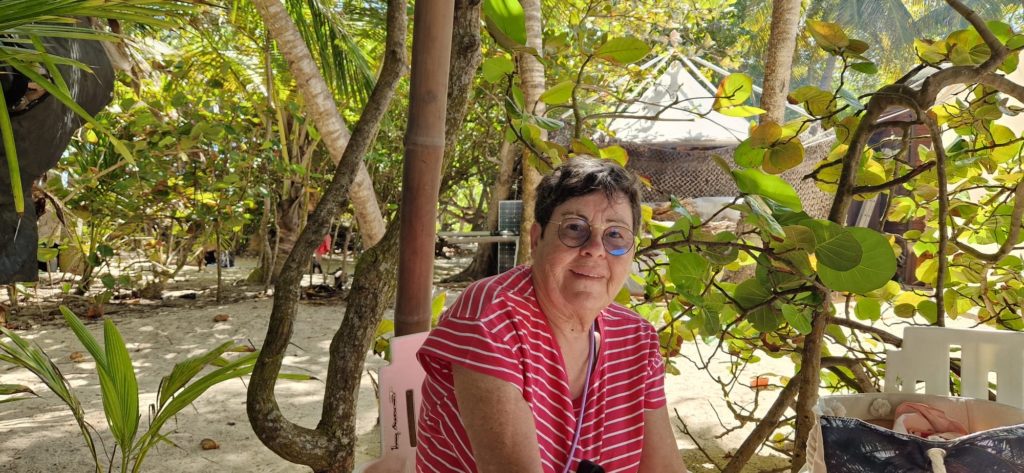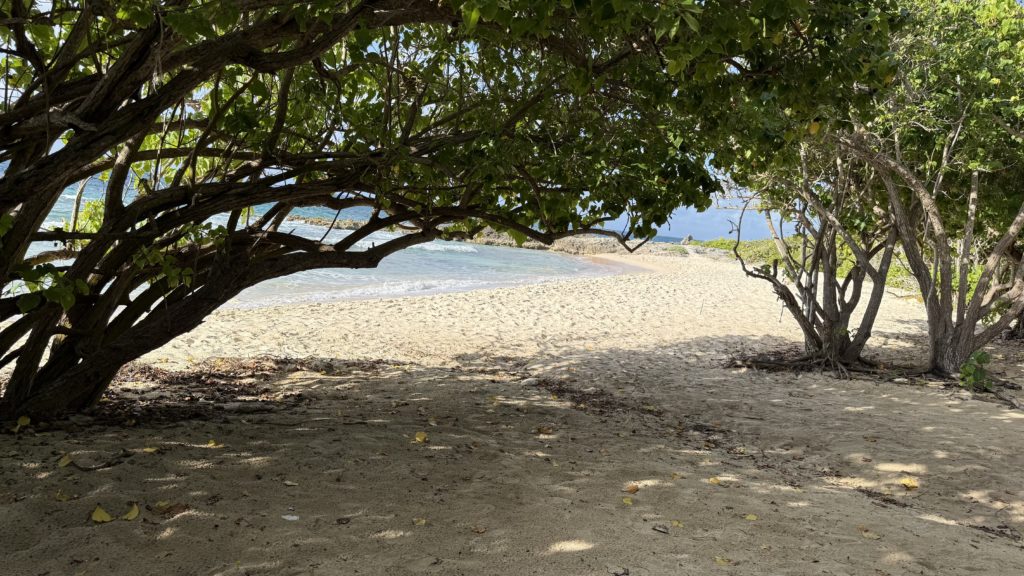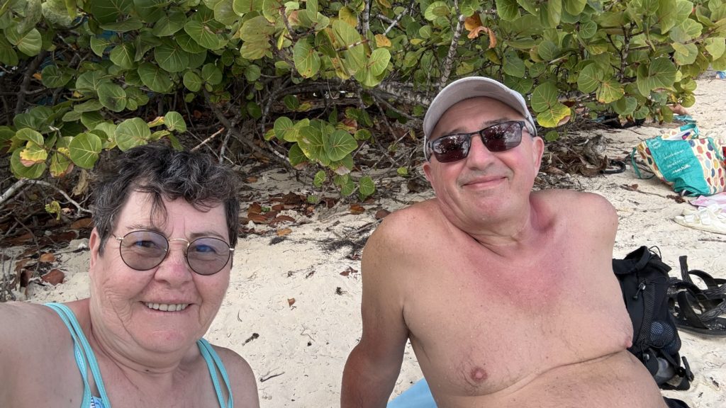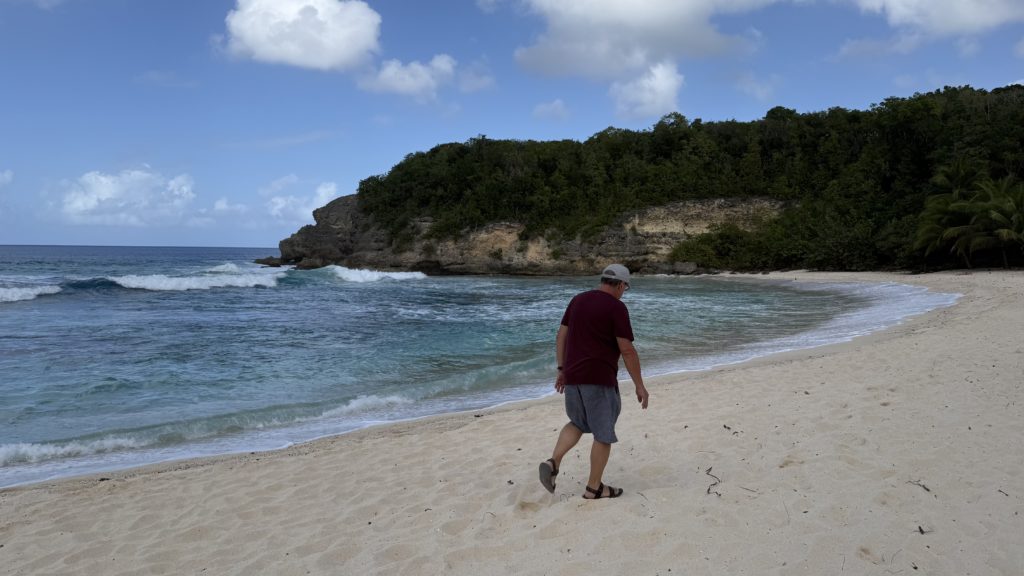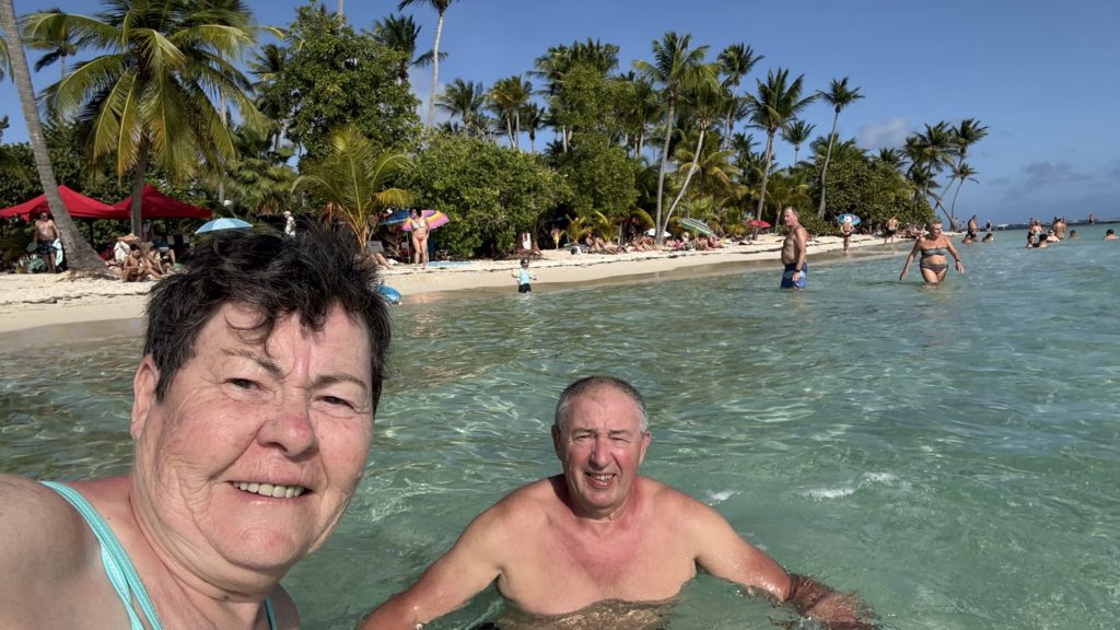 Nous voilà partis. On trouve le Club Med, on se gare et il faut marcher bien 500 m avant d’arriver à la plage de la Caravelle. Il y a beaucoup de monde, mais c’est vrai que cette plage est très très belle. On trouve un petit coin d’ombre, on s’installe, on va se baigner.