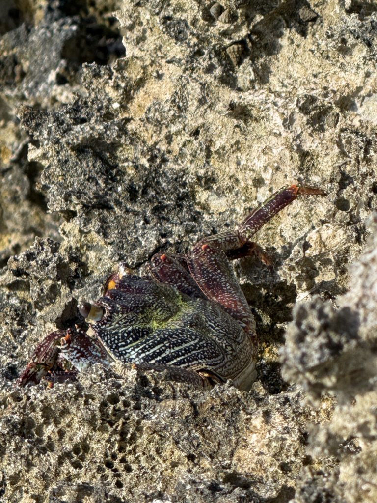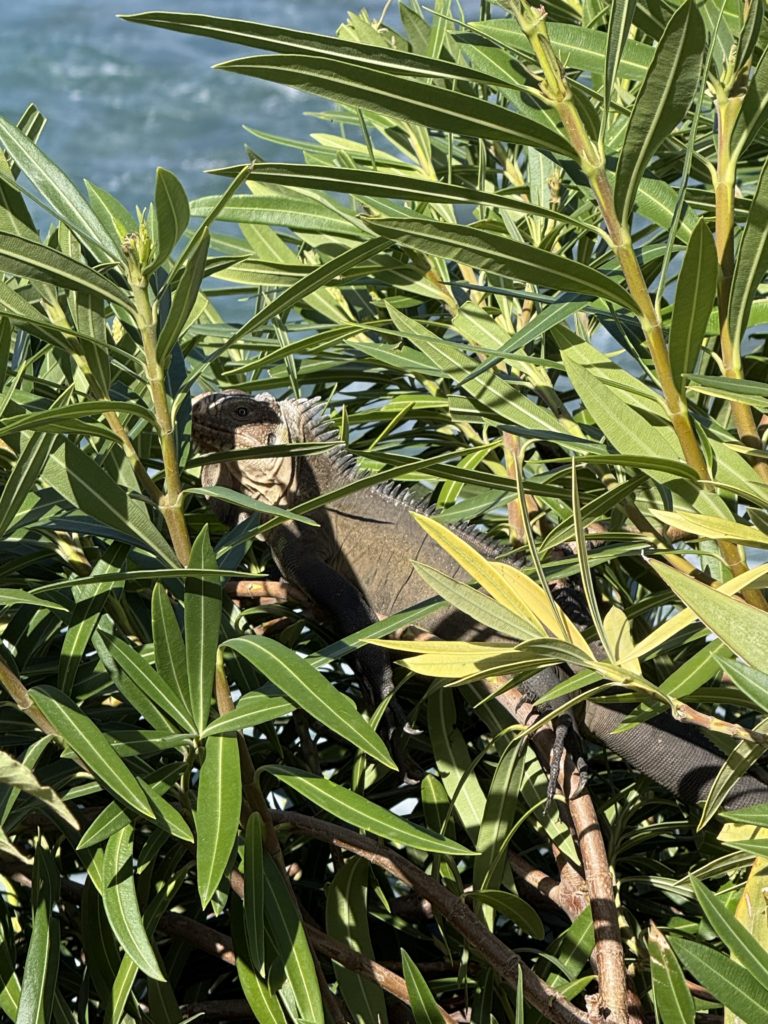 À mon goût, l’eau est un peu fraîche, mais peut-être aussi que j’avais très chaud. On s’installe ensuite sur nos serviettes et on admire le paysage. Tout d’un coup, un bruit derrière nous : qu’est-ce que c’est ? Un petit lézard qui court ? Ah oui, le petit lézard court parce qu’il y a un immense iguane qui le chasse. Qu’est-ce qu’il est beau, d’un beau vert, mais je n’irais pas le caresser.