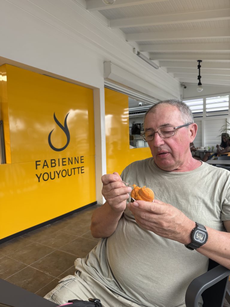 On arrive vers notre voiture et un vendeur de sorbets nous accoste en appelant « mon doudou » Maurice et moi « ma princesse ». Il nous explique comment il fabrique ses sorbets aux fruits de la passion et à la coco. Maurice prend fruit de la passion et moi coco : un vrai délice, et après cette balade ça fait un bien fou.